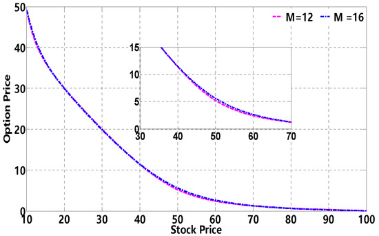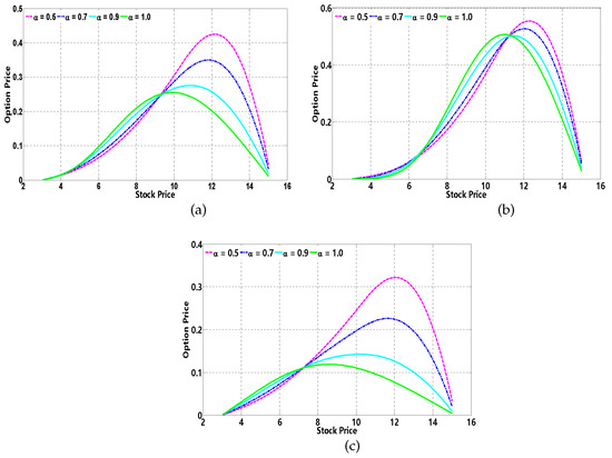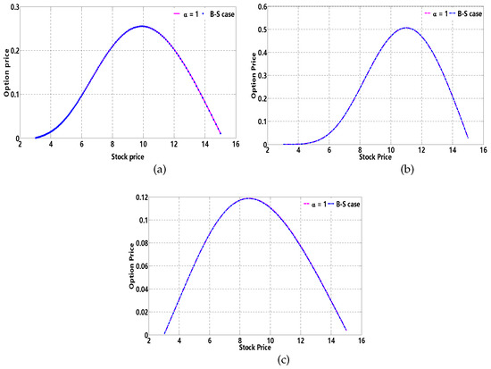 It is clear that the time fractional B-S model is consistent with the classic B-S model when . In this paper, are selected. As a matter of fact, the solution procedure is applicable to other values of and .