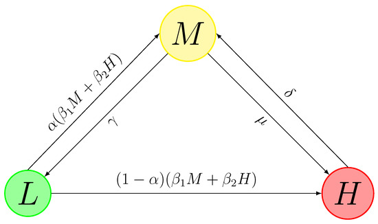 represents the transition rate of Low-risk areas to Medium-risk areas by contacting the High-risk areas.