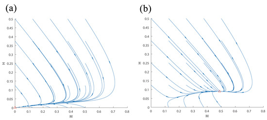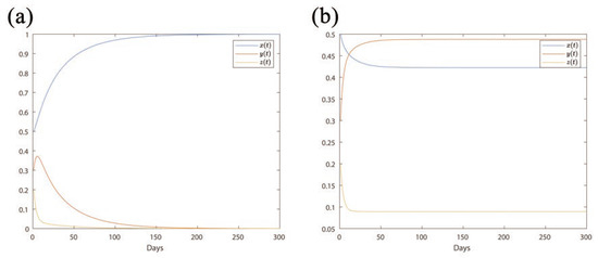 Thus, the real part of the two roots of the above equation is negative if . Hence, the EE is locally asymptotically stable if . □