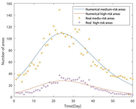 25]. The data were fit with the established LMH model using a nonlinear equation solver in MATLAB. The data are the variation of the proportion of Medium- and High-risk areas along with time. The yellow star dots represent the real proportion of Medium-risk areas, and the violet cross symbols represent the proportion of real High-risk areas. The lines are the data-fitting results of the LHM model. The blue line represents the numerical proportion of Medium-risk areas, and the red line is the proportion of High-risk areas.