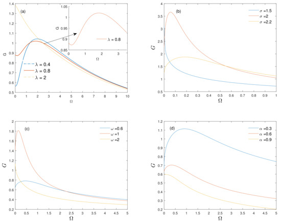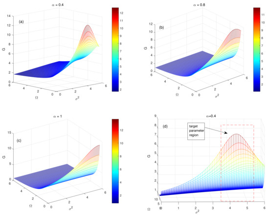 The output gain G as function of under different values of system parameters, respectively. The values of the parameters are: (a) and , (b) and , (c) and , and (d) and .