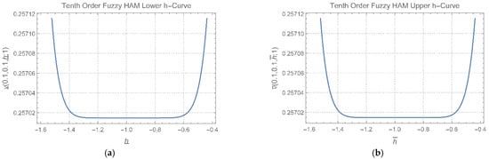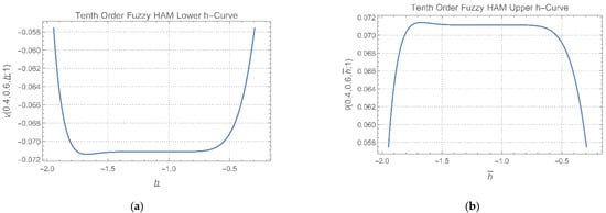The h-Curve of 10th-order fuzzy approximate-analytical solution of Equation (33) at , , . (a) Fuzzy HAM lower h-Curve. (b) Fuzzy HAM upper h-Curve.