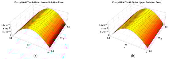 The accuracy of 10th-order fuzzy approximate-analytical solution of Equation (33) at , , , for all . (a) Fuzzy HAM lower error. (b) Fuzzy HAM upper error.