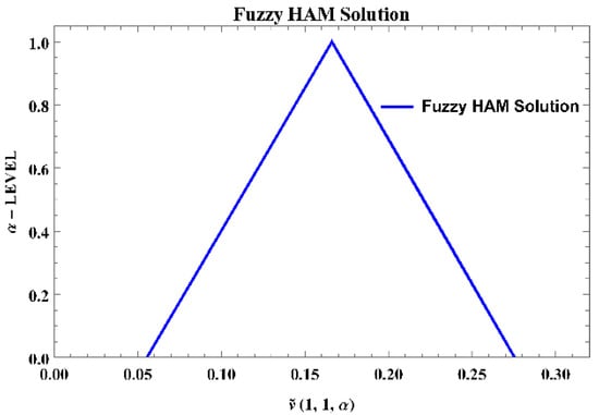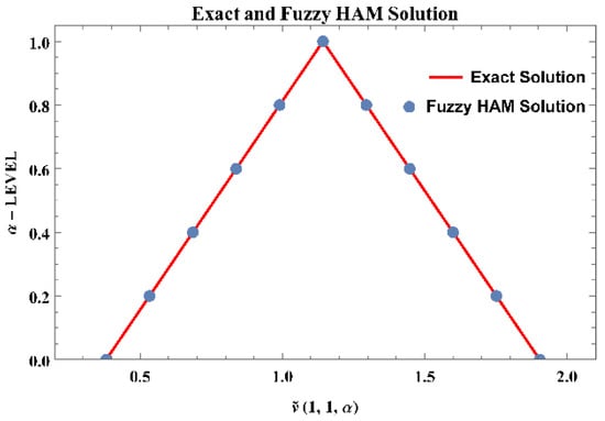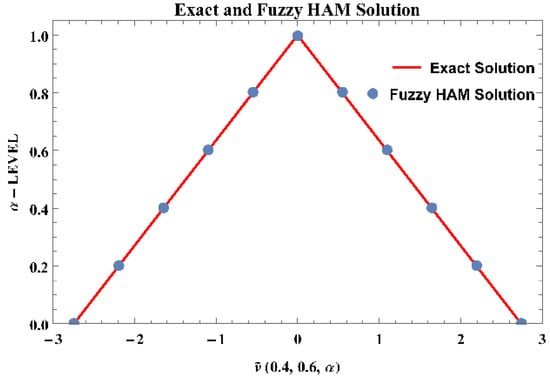 The 10th-order fuzzy approximate-analytical solution of Equation (33) and accuracy at , , , for all .