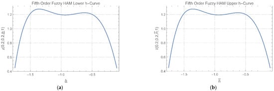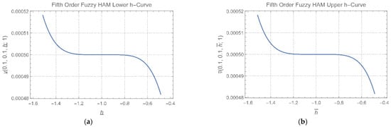 The h-Curve of 5th-order fuzzy approximate-analytical solution of Equation (36) at , , . (a) Fuzzy HAM lower h-Curve. (b) Fuzzy HAM upper h-Curve.