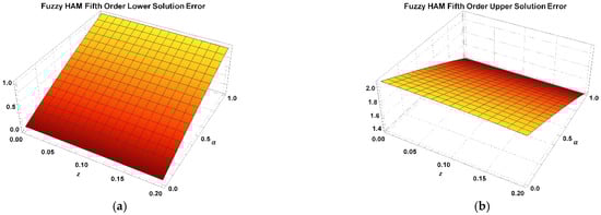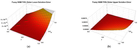 The accuracy of the 5th-order fuzzy approximate-analytical solution of Equation (36) at , , , for all . (a) Fuzzy HAM lower error. (b) Fuzzy HAM upper error.