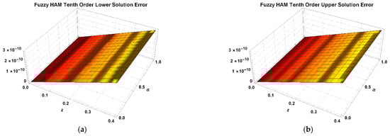 The accuracy of the 10th-order fuzzy approximate-analytical solution of Equation (39) at , , , for all . (a) Fuzzy HAM lower error. (b) Fuzzy HAM upper error.