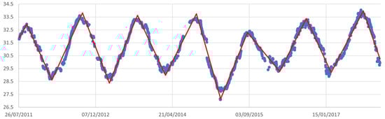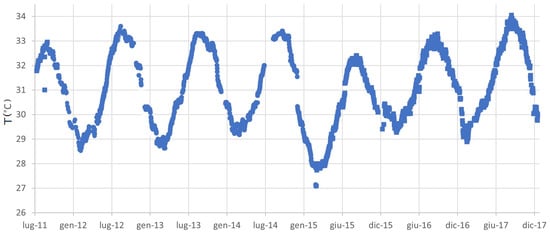 The model in Equation (1) was adopted to analyze the time series of the recorded temperatures of the Campi Flegrei caldera soil (cf. Sabbarese et al. []). The initial dataset consisted of observations collected at the times indicated by and shown in the scatter plot in Figure 1.