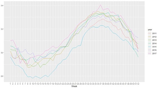 Seasonal plot of the temperatures described by . This was obtained by taking weekly spaced values from the time series and representing each year of observation (2011–2017) separately.