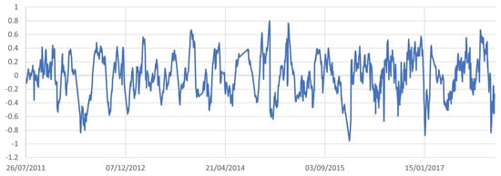 In this section, we focus on the investigation concerning the nature of the time series . To this aim, some preparatory interpolations were performed on the dataset, as is customary. Since the times of the initial series were not equally spaced, we collected the missing data by performing a linear interpolation covering the whole observation period. The prepared dataset obtained after this phase consisted of observations. A plot of is shown in Figure 4.