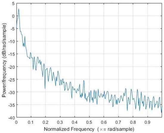 In order to achieve the best possible approximation for the Fourier spectrum, many modified versions of the periodogram have been devised. In particular, we chose the estimation of using the modified periodogram method suggested by Welch in []. The technique consists of dividing the signal into overlapping segments and averaging the modified periodograms calculated in each window to obtain the final result. The modified Welch’s periodogram is shown in Figure 7.