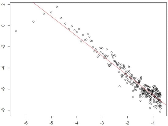 Hence, by applying a log-log transformation on the frequencies and the estimated periodogram, we obtained the plot shown in Figure 8. The estimate of obtained as the slope of the regression line is given by