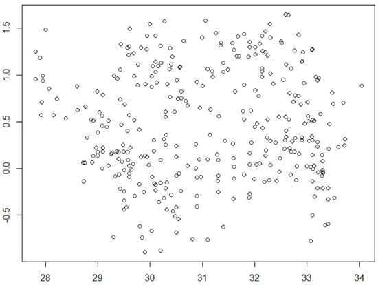 with respect to the values of (see Figure 9). Notice that the residuals do not seem to follow a specific path; rather, they appear to be distributed randomly with respect to .