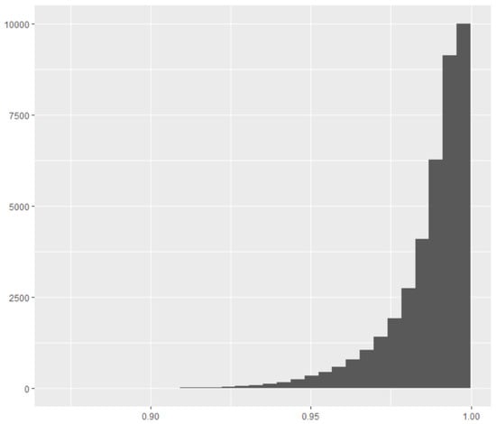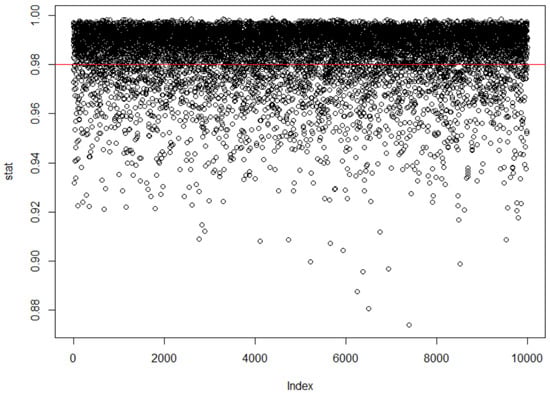 where refers to the ith simulation and where represents the sample mean of . The coefficients , as is well known, are related to some moments of the order statistics of i.i.d. random variables sampled from the standard normal distribution. The values of , as in Equation (7), ranged between 0 and 1. The ith test rejects the Gaussian hypothesis when is close to 0, and hence we accepted the null hypothesis if for . As shown in Figure 10, a large proportion of the values of was greater than . This result was observed for more than 70% of the values of even for various repetitions of the n-simulation procedure (cf. [,]). This was also confirmed by the cumulative histogram of shown in Figure 11. The results of the test suggest the acceptance of the Gaussianity hypothesis.