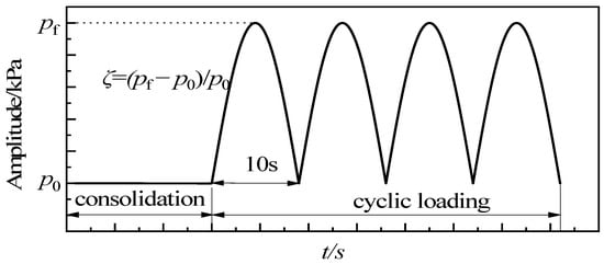 Soil samples were saturated before the tests in vacuum equipment: air was sucked out to maintain negative pressure for 3 h, then airless water was added and samples were soaked for 12 h. The specimens were then consolidated under the consolidation surrounding pressure p0. After the consolidation was completed, a one-dimensional cyclic load was applied to the specimen. Using a semi-sine wave as a stress waveform, the dynamic stress amplitude is pf; the cyclic dynamic stress ratio ζ indicates the difference between the dynamic stress amplitude pf, and the consolidation confining pressure p0 ratio to the consolidation confining pressure p0, and ζ = (pf − p0)/p0. According to Table 1, the amplitude of cyclic dynamic stress pf can be obtained by determining the consolidation confining pressure p0 and the cyclic dynamic stress ratio ζ. N refers to the number of loaded half-sine waves experienced, and the total number of vibrations is recorded as Nmax (set Nmax = 20,000). Vibration frequency in f refers to the reciprocal of each half-sine wave time course (set f = 0.1 Hz). The loading and waveform diagram is shown in Figure 2.