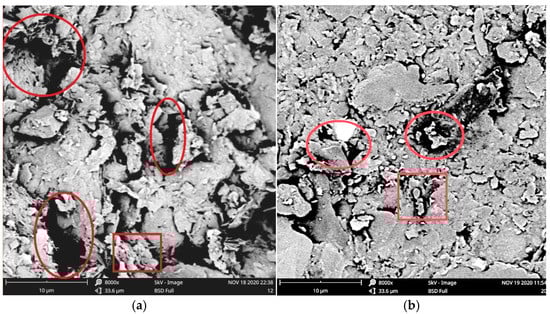 Microscopic scanning images before and after loading []: (a) before loading; (b) after loading. OCR = 9 identifications of porosity units. (The circle was marked as a pore, and the square was marked as a flocculent structure).