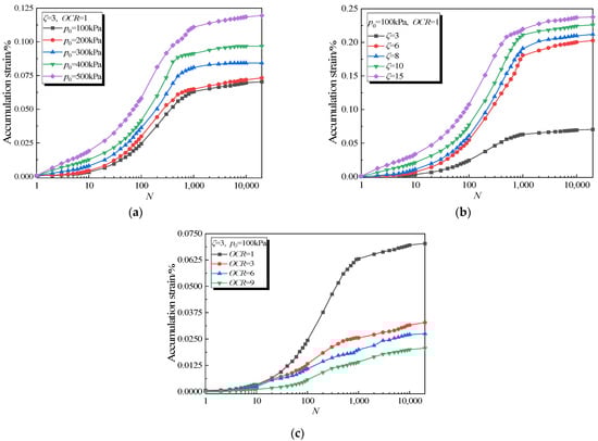 It is worth noting that as the overconsolidation ratio continues to increase, the final cumulative strain of the specimen gradually decreases (Figure 5c). The reason is that under a high overconsolidation ratio the soil has a stronger resistance to deformation, resulting in a smaller final cumulative strain. This indicates that the increase in the overconsolidation ratio has an inhibitory effect on the cumulative strain.