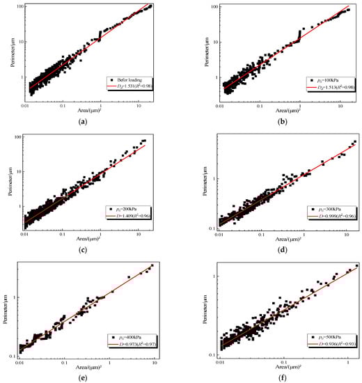 Fractal dimension of soil samples under different pressure: (a) before loading; (b) p0 = 100 kPa; (c) p0 = 200 kPa; (d) p0 = 300 kPa; (e) p0 = 400 kPa; (f) p0 = 500 kPa.
