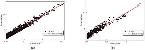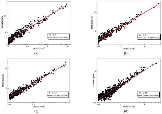 where Perimeter represents the equivalent perimeter of any geometric polygon in the scanned image; Area represents the equivalent area of the corresponding polygon; Dd represents the fractal dimension of the particle shape of the soil corresponding to the scanned image; and C is a constant influenced by the microstructure characteristics of the material. The fractal information can be used both in microstructure and numerical simulation experiments [].