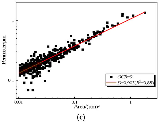Fractal dimension of soil samples under different overconsolidation ratios: (a) OCR = 3; (b) OCR = 6; (c) OCR = 9.