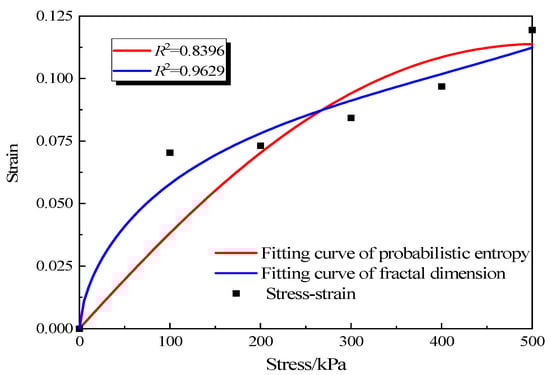 As shown in Figure 9, the formula of cumulative plastic strain with fractal dimension as the microstructural parameter has a higher correlation coefficient (0.9629) than the formula with probabilistic entropy (0.8396) as the microstructure parameter. Consequently, the fractal dimension can describe the cumulative plastic strain law of Hangzhou’s soft soil more accurately. In future studies, other microstructural parameters could be investigated to make the fitted formula curve closer to the experimental data.