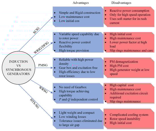 Various typologies and configurations are developed utilizing the MPPT techniques to improve power conversion technologies and employing different generator types []. For instance, DC generators, synchronous generators (SGs), and induction generators (IGs) are the three major types of generators used in WECS that operate using wound rotors [,]. Other types of generators reported in the literature employed in WECS are wound rotor induction generators (WRIGs) [], squirrel cage induction generators (SCIG) [,,], DC generators [], variable reluctance generators (VRGs) [], switched reluctance generator (SRGs) [], and permanent magnet synchronous generators (PMSGs) [,]. Two major categories of WRIGs are DFIGs and dynamic slip-controlled generators []. These generators are compared regarding their advantages and disadvantages in Figure 3. Electronic devices are the backbone for the control and flexible operation of grid-connected WECS in transient and steady-state operation [,]. Before introducing AC-DC-AC converters in the 2000s, soft starters were initially used in the 1980s for the grid connection of SCIGs []. In contrast, chopper circuits combined with diode bridges were utilized to control WRIGs using rotor resistance []. The back-to-back converters have the advantages of transferring a high and smooth electricity quality after extracting maximum power from wind [,]. In grid-connected operation, the DFIGs use partially scaled [,] back-to-back converters rated at 30% of the generator rating [] and have the advantage of speed control using AC excitation []. The stator of DFIG is directly connected to the grid, whereas the rotor is connected to the grid using back-to-back converters. The partially scaled converters control the rotor speed and perform active and reactive power decoupled control with reactive power compensation []. The disadvantage of DFIG-based WECS is the protection problems under grid fault perturbations and the use of slip rings.