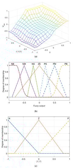 Here, the system state variables are shown by and , and and represent the nonlinear function and control gain function; the control input is shown here by u. In sliding mode theory, the ultimate goal is the design of an appropriate sliding variable R so that, during sliding mode , a good compensation of system dynamics is achieved. The derivative of can be expressed as follows [].