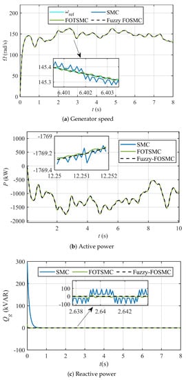 The first-order SMC is the most basic and simple control design for DFIG-based WECS. The SMC provides a suitable compromise between torque oscillations and efficiency of power conversion [,,]. The author in [] proposed SMC schemes using the first-order SMC, where the surface was chosen as the power tracking error. The reference power is selected as less than the maximum power to keep an energy buffer for frequency change under abrupt load conditions. A test bench developed at NREL FAST is used to validate the proposed scheme. A similar concept was introduced in [,] for grid-connected WECS. The first-order SMC schemes mentioned before are of a continuous nature. Utkin in [] stated that the SMC schemes are inherently affected by an undesirable phenomenon of chattering that proves to be harmful for the system and causes a low control accuracy, high wear and tear of system parts, and high losses. This phenomenon is due to the discontinuous switching control law in the continuous control schemes. The author in [] suggest an exponential reaching law to eliminate the chattering problem instead of the constant reaching law. The gain in the exponential-reaching-law-based SMC is scheduled according to the magnitude of error. The gain is increased with an increase in error and decreases with a decrease in error. The enhanced reaching law proposed by [] is given as: