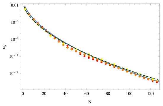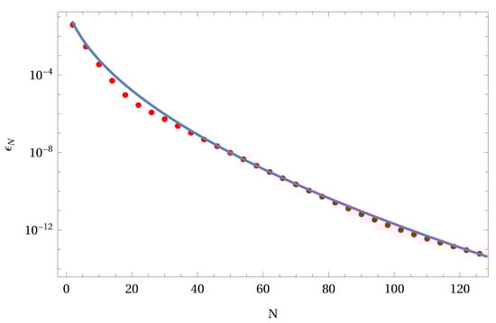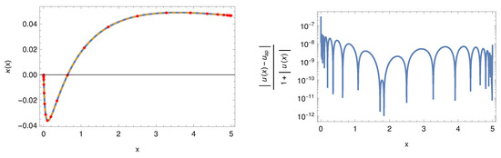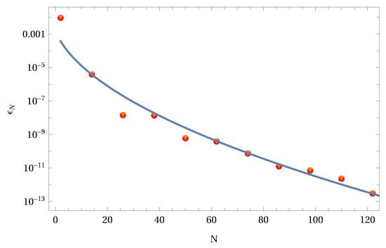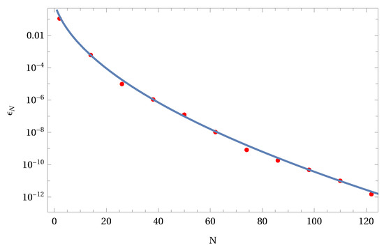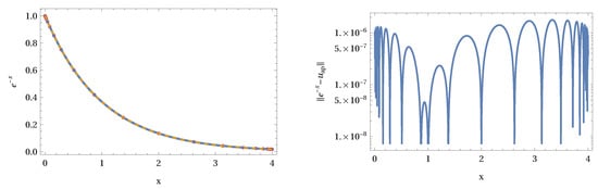 First, we verify the accurate representation of the approximation shown in Figure 11. The left panel shows the function approximation using . In Figure 12 we examine the error based on the norm of the relative local error. The error shows an exponential decay if the number of approximation points N is increased. The upper bound of this decay follows the relation (30) which is indicated by the solid line.