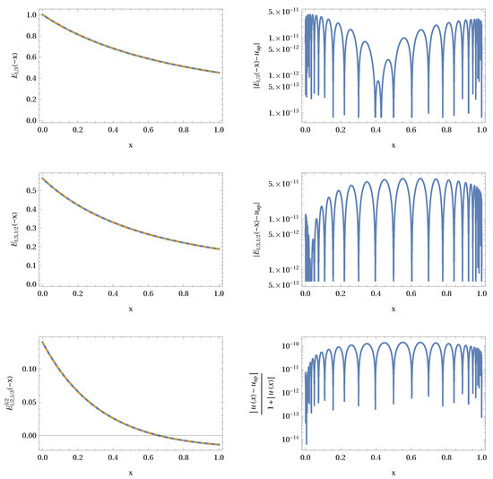 In Figure 3 we graph the solution for the one-, two-, and three-parameter ML function for a specific selection of parameters (left column of Figure 3). The dashed lines correspond to the Sinc approximation while the solid line represents the Mathematica approximation for the first two ML functions and a higher order Sinc approximation with for the Prabhakar ML function. Obviously there is no visible difference for all three types of ML functions. This becomes obvious if we examine the right column of Figure 3. Here the absolute value of the local error is shown for the two first ML functions and a relative error for Prabhakar’s function. The magnitude in all cases is less than . Figure 4 collects the error decay as a function of the number of Sinc points N used in the approximations. It is obvious that for all three types of ML functions nearly the same functional error decay results. This indicates that the upper bound estimation of Equation (30) is satisfied and allows an a priori estimation of the expected error.