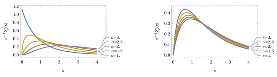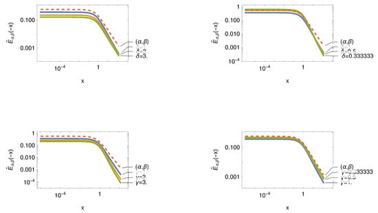 The Mellin representation of the extended Mittag-Leffler function is similar to the two parameter Mittag-Leffler function represented as Fox H function with three Γ terms. The numerator is exactly the same as the Equation (40). The denominator term is weighted by the coefficients δ and γ. The term containing the weight of δ is the same as (40). The difference exists only in the γ weighted term. If we select and , we reproduce the two parameter Mittag-Leffler function . To examine the influence of the two weight parameters δ, , we vary them and represent the results in Figure 14. The Figure indicates that a variation of either of δ or γ in a fractional or integer way will approach the two parameter Mittag-Leffler function from above or below, respectively. In Figure 14 we represent in each row the variation of the parameter δ and γ. The left column of the Figure show changes approaching values larger than one, while the right column shows an approach to smaller values than one. Larger values than one separate the graph of the wML function from the two parameter ML function. Smaller values than one move the graphs of the wML function towards the unweighted ML function, or transpass the ML function in case of δ variation. In addition, we observe that the asymptotic values for larger x values approach a different asymptotic behavior of the ML function. While for (top row) the asymptotic slope is nearly the same for (bottom row) we observe a fanning out of the asymptotic behavior. In general, we can state that the asymptotic behavior of the wML function assumes a different slope than the ML function, which is typically larger than the slope of the ML function.