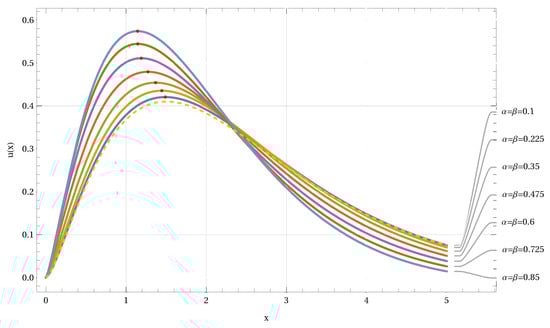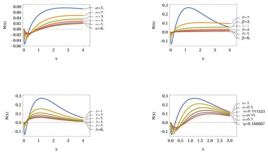 where α, β, δ, and η are all derived from . Variation of the parameters α, β, δ, and η result in distinct variations of the function according to the definition of the ℵ function in (54) and (55). Figure 13 depicts the variation results. We can see that the function behavior varies continuously within a defined region of parameters.