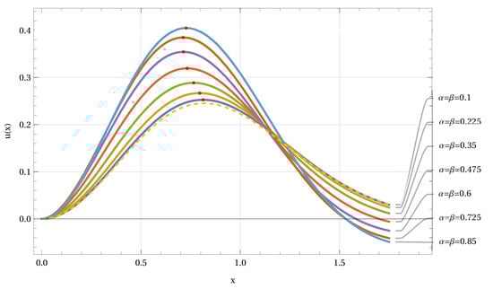The second situation considered is given by with and . We also modified the weights δ and γ for this set of parameters, resulting in Figure 16. A comparison of Figure 15 and Figure 16 illustrates that changing the relationship between α and β modifies the original function . If pronounced peaks and minima appear, while just a prominent maximum and shallow minima appear in the opposite case. The position of maxima is marked by dots in both Figures.