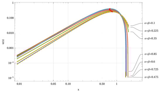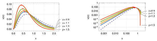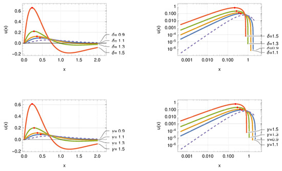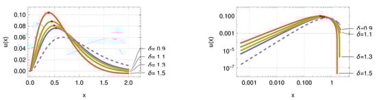 i.e., in the convolution, we replace the Fox H function with an ℵ function. This is a simple assignment in terms of basic arithmetic. The related integral equation, on the other hand, will convert to an unknown equation. We will employ Sinc convolution techniques to produce the function once more, [7,13]. Consider first the case when with and . As previously stated, the weights γ and δ allow for the adaptation of the function to a desired structure, which is more adaptable to a specific instance than the Fox H example. This trait is depicted in Figure 15. The weights allow the curves in the double logarithmic representations to be spread out by approximately four decades in amplitude.