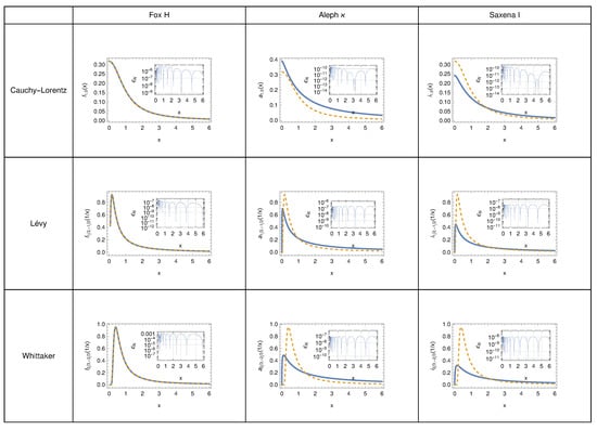 as integrand in (62) and get or , respectively. The results are quite interesting and have some similarities with the original definition of the one-sided stable distribution function. The results are collected for a view examples in Figure 17. We depict the Cauchy-Lorentz case with , the Lévy case using , and one of the Whittaker cases using shown in each row, respectively. The Fox column in Figure 17 shows the one-sided stable distribution. The Aleph- and the Saxena columns represent the graphs based on the respective function representation. As a reference, we graph in each row the analytic representation of the function as a dashed line. For Cauchy-Lorentz we have , the Lévy distribution is , and the Whittaker distribution is , where is Whittaker’s W function. The “distributions” based on Aleph or Saxena are graphed as solid lines. We also included an inset to each graph that shows the approximation’s local absolute error. The Aleph and Saxena-based approximations clearly resemble the original distribution in various ways. If the weights are experiencing some limiting process like and , the original distribution can be restored using the Aleph approximation. We don’t have the freedom to adjust the numerical approximation in the Saxena approximation; the numerical approximation is set. The local absolute and relative error is a minor number, as seen in the insets. Furthermore, we may infer from Figure 17 that the asymptotic behavior of the Aleph and Saxena approximations take the values of the Fox H function.
