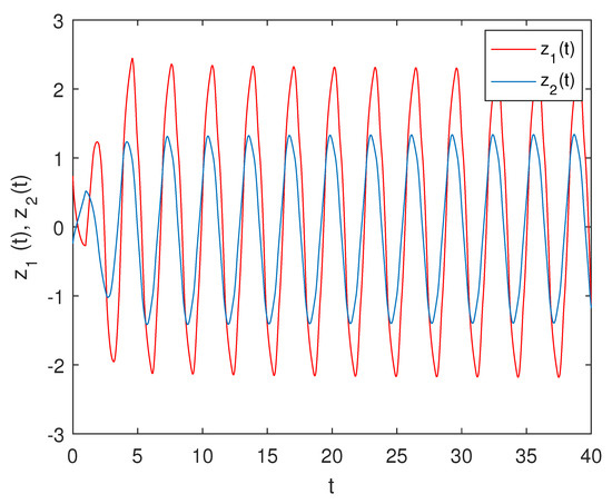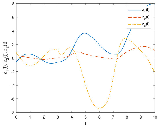 Consider a three-dimensional delayed FNNs (1), , , , , , , , . By simple calculation, one has . Figure 5 shows the evolution of the system (2) without controller when , . Take , such that ; then, the simulation results are displayed in the following.