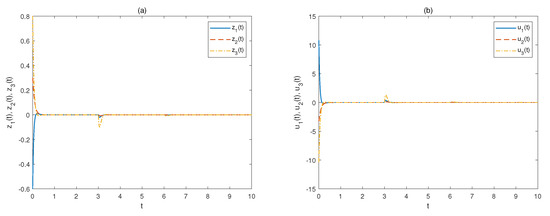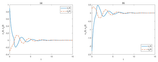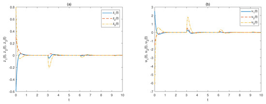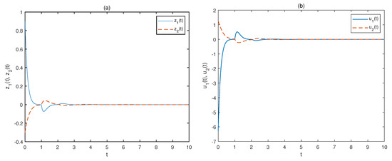Take the set as and select , , . Then, based on the scheme B, one can obtain , , , , , and the control gain matrix . From Figure 4a,b, we can find that the closed-loop delayed FNNs (2) can achieve the asymptotical stability with the obtained saturating controller.