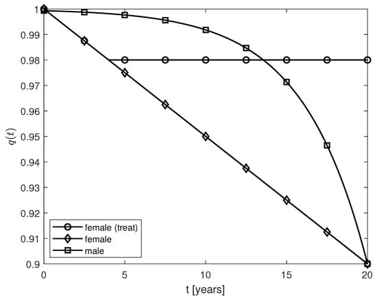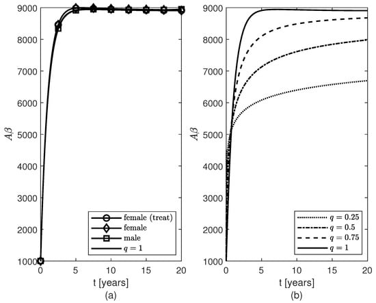 The variable fractional order models neuroprotection loss due to AD progression with age. It is assumed that post-menopausal females with AD experience a sharper decrease in neuroprotection than age-matched males with AD. Given the current lack of knowledge about the temporal decrease of neuroprotection with age, sex, and/or AD, the sex-dependent shapes of are inspired by the fact that post-menopausal females lose sex hormones rapidly, while the age-related decline in the neuroprotective testosterone in males happens gradually []. Thus, the following sex-dependent expressions for are proposed: