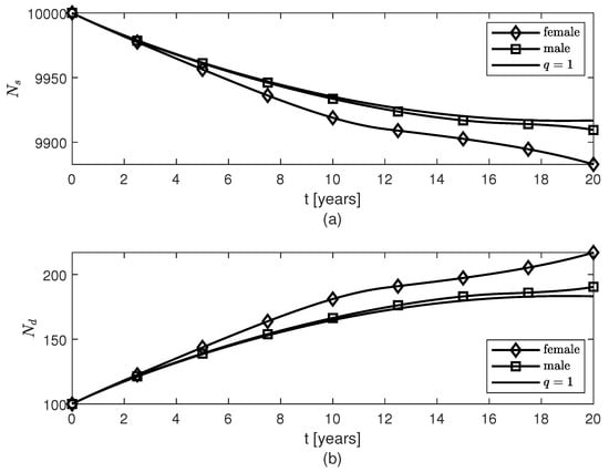 Temporal variations of populations of (a) surviving neurons , and (b) dead neurons , for variable fractional orders modeling females’ and, respectively, males’ neuroprotection loss due to the AD progression with age.