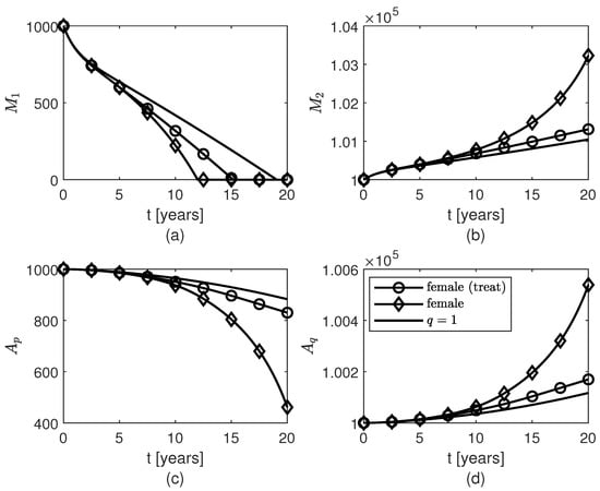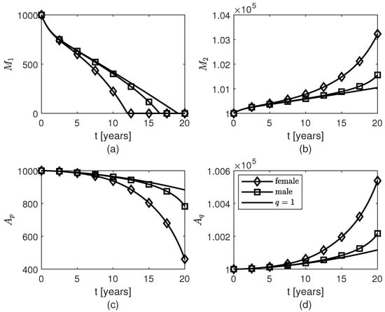 Temporal variations of populations of glial cells: (a) pro-inflammatory microglia , (b) anti-inflammatory microglia , (c) proliferative reactive astrocytes , and (d) quiescent astrocytes for variable fractional orders modeling female’s and, respectively, male’s neuroprotection loss due to the AD progression with age.