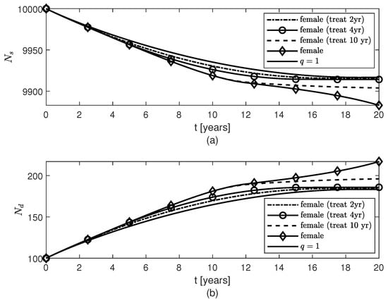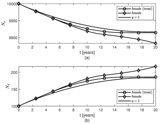 Figure 5, Figure 6 and Figure 7 show temporal variations of the populations of brain cells of post-menopausal females with AD for the case when the variable fractional order is given by formula (12). A treatment for AD is designed such that the level of neuroprotection is kept constant for , where is the year when the treatment starts. Not only does this treatment slow down the loss of surviving neurons after approximately 2 years of keeping the level of neuroprotection constant, but also the populations of and cells increase slower after although the amount of present is unchanged by the treatment (Figure 2a). As expected, the sooner the treatment starts the more neurons are saved and thus the better the outcome will be (Figure 7). Again, the shape of the variable fractional order (12) is transferred to the dynamics of the population of surviving neurons (Figure 5a and Figure 7a).
