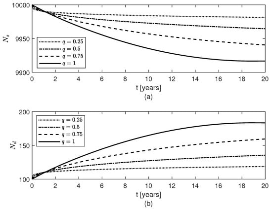 The variable-order fractional derivative (8) has the following desirable properties: (1) it models variable fading memory with no memory of its past order [] which gives it the ability to transfer to the output certain features of the variable order function []; and (2) it conserves physical causality [] (the causality-preserving operator of [] coincides with formula (8) for continuous functions which are used as mathematical representations of populations’ dynamics). If is a constant, then the derivative (8) reduces to the left-sided Caputo fractional derivative of order q whose memory gets longer as q gets smaller [].