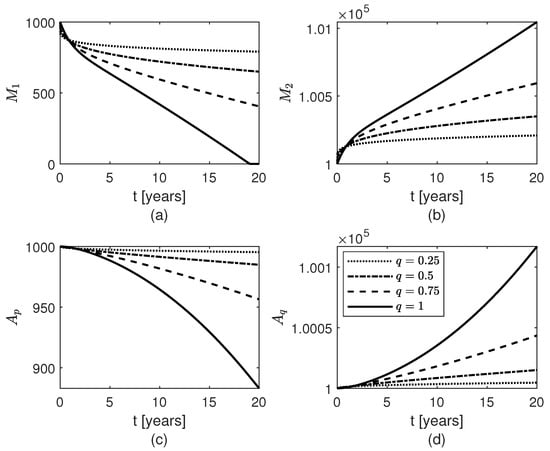 Lastly, Figure 2b, Figure 8, and Figure 9 show results for the constant fractional order case. As the fractional order decreases from 1 to 0, the population of fibrils gets smaller (Figure 2b) and, consequently, the least decrease in the population of surviving neurons (Figure 8a) and the least increases in the populations of and cells (Figure 9b,d) are observed. For the differential operator (8), a smaller value of the constant fractional order q confers a longer memory which translates into a longer protection against AD. Thus, the longer the memory of neuroprotection is due to treatment the better the outcome will be.