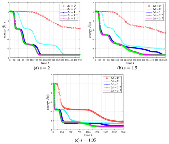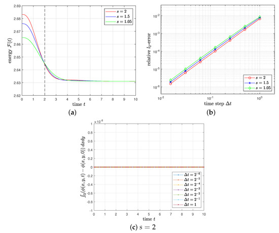 on Ω = [ 0 , 32 ] × [ 0 , 32 ] . We set ϵ = 0.025 , β = 1 , Δ x = Δ y = 1 3 , and t o l = 10 8 Δ t , and we compute ϕ ( x , y , t ) for 0 < t 10 . For s = 2 , 1.5 , 1.05 , Figure 1a,b show the evolution of F ( t ) for the reference solution with Δ t = 2 8 and the relative l 2 -errors of ϕ ( x , y , 2 ) for Δ t = 2 6 , 2 5 , , 1 , respectively. Here, the errors are computed by comparison with the reference solution. Figure 1c shows the evolution of Ω ( ϕ ( x , y , t ) ϕ ( x , y , 0 ) ) d x d y for s = 2 and various time steps. It is observed that the method is second-order accurate in time and conserves the mass.