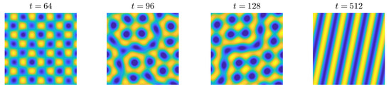 To demonstrate the energy stability of the proposed method, we take the initial conditions (18) on Ω = [ 0 , 32 ] × [ 0 , 32 ] , and use ϵ = 0.25 , β = 1 , Δ x = Δ y = 1 3 , and t o l = 10 8 . For s = 2 , 1.5 , 1.05 , Figure 2a–c show the evolution of F ˜ ( t ) with different time steps, respectively. The energy curves are all nonincreasing in time, which verifies that the proposed method is unconditionally energy stable (Theorem 3). Moreover, the solution with s = 2 and a sufficiently small time step Δ t = 2 4 is stable at around t = 224 (see the magenta line with dots in Figure 2a); however, the case of s = 1.05 is not stable even at t = 512 (see the magenta line with dots in Figure 2c). These results show that the lifetime of the unstable interface is prolonged as the fractional order s decreases, i.e., a longer time computation is needed to reach a steady state. Figure 3 shows the evolution of ϕ ( x , y , t ) with s = 2 and Δ t = 2 4 .
