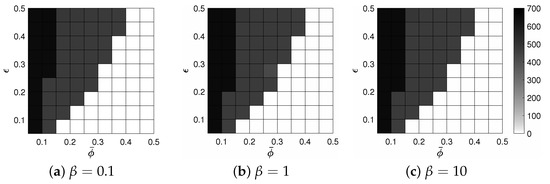 where A = 1 2 max x Ω ϕ ( x , t f ) min x Ω ϕ ( x , t f ) . In the numerical simulations, we set A = 0 if A is less than 10 8 . Figure 4a–c show Λ ( t ) at t = t f with various ϕ ¯ = 0.05 , 0.1 , , 0.5 and ϵ = 0.05 , 0.1 , , 0.5 for β = 0.1 , 1 , 10 , respectively. The results in Figure 4 are consistent with the phase diagram in [1,23]. Sample time evolutions of Λ ( t ) with ϕ ¯ = 0.05 , 0.1 , , 0.5 and ϵ = 0.3 for β = 0.1 , 1 , 10 are shown in Figure 5a–c, respectively. Figure 6 shows ϕ ( x , y , t f ) with various ϕ ¯ and ϵ for β = 1 .