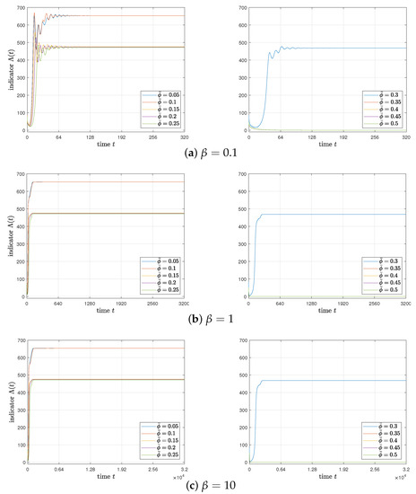 Figure 5. Evolution of Λ ( t ) with ϕ ¯ = 0.05 , 0.1 , , 0.5 and ϵ = 0.3 for different β .