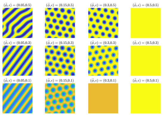 In 2D, the phase diagram contains constant ( ϕ c ), striped ( ϕ s ), and triangular ( ϕ t ) states depending on the values of ϕ ¯ (the average density) and ϵ , and these states can be approximated by ϕ c = ϕ ¯ , ϕ s = ϕ ¯ + A s sin ( x ) , and ϕ t = ϕ ¯ + A t cos 3 x 2 cos y 2 1 2 cos ( y ) , where A s and A t are the characteristic amplitudes [23]. To verify that the proposed method does lead to the expected states, we take the initial conditions as ϕ ( x , y , 0 ) = ϕ ¯ + rand , ψ ( x , y , 0 ) = 0 on Ω = [ 0 , 32 ] × [ 0 , 32 ] , where rand is a random number between 0.1 and 0.1 at the grid points. We use s = 2 , Δ x = Δ y = 1 3 , Δ t = 1 4 β , and t o l = 10 9 β , and we compute ϕ ( x , y , t ) for 0 < t t f = 3200 β . To estimate the phase diagram numerically, we calculate the following indicator function: