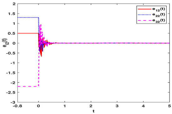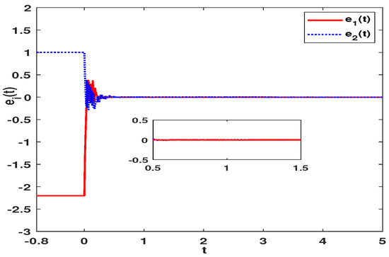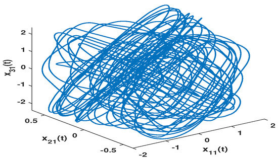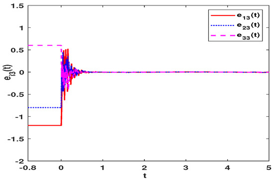 For master system (57), we set the as x-axis, as y-axis and as z-axis. Then the chaotic curves of states , and are exhibited in Figure 1, Figure 2 and Figure 3. As can be seen from the pictures, the system presents chaos. The existence of this chaos characteristic can realize the chaos masking of signals, which makes FMNNs have a good application in secure communication. The error curves of , and under the controller (11) are shown in Figure 4, Figure 5 and Figure 6. It can be clearly seen that under the action of controller (11), the errors converge to 0 in finite time. According to (30), the reaching time is calculated as s. Based on (39), the synchronization time of the errors is calculated as s. The constant is calculated as On the basis of Figure 4, Figure 5 and Figure 6, the synchronization time is s, and it is far less than s.