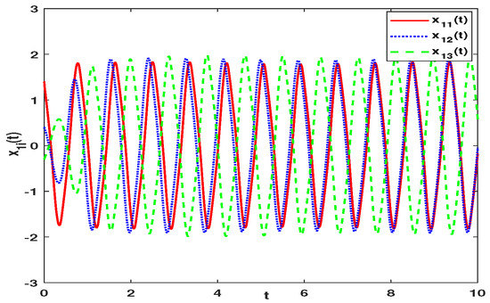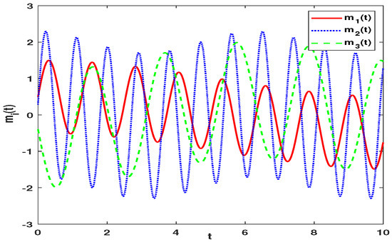 To explain the whole process of secure communication better, the signal masking method is used to encrypt plaintext signals here. Let be the transmitted signal, in fact is also the ciphertext signal. The is generated by the sender and is the plaintext signal. It should be noted that in order to avoid affecting the chaotic characteristics of the main system, the should be small enough. The ciphertext signals are sent by the sender and received by the receiver. With the aid of the FATSMC, master–slave synchronization is realized and plaintext signals are finally recovered. In addition, Figure 12 exhibits the secure communication policy. In above numerical examples, the FMNNs with three nodes are discussed, and the first node of the FMNNs is used for secure communication.